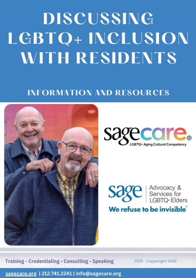 After completing a SAGECare training, many people ask us about discussing LGBTQ+ inclusion with their residents or older adult constituents. These conversations are essential, and trusted staff members are best to lead them. The following are resources to help generate discussion.