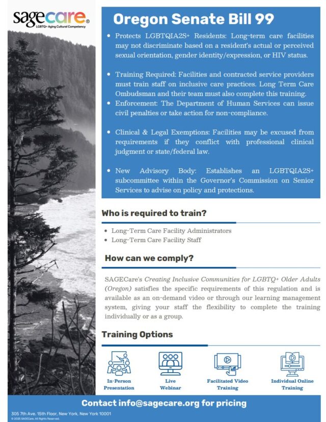 Senate Bill 99 prohibits certain facilities that provide long term care from taking specified actions based in whole or in part on resident’s actual or perceived sexual orientation, gender identity, gender expression or human immunodeficiency virus status.