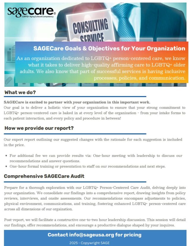 SAGECare offers LGBTQ+ cultural competency training and consulting to aging service providers.